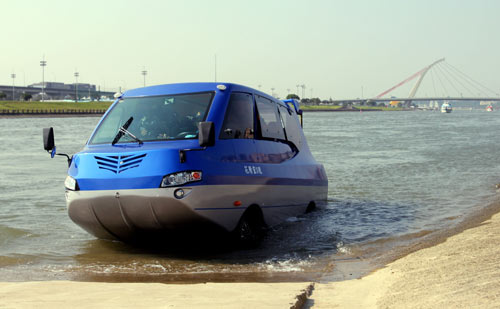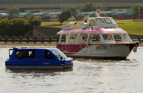台湾中环集团日前发布电动水陆两用车,23日在美堤河滨公园试乘,未来将配合台北花卉博览会提供载客服务。图片来源:“中央社”