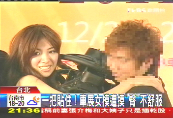 台湾几位美胸皇后被邀请作为车模亮相2010年台北车展,低胸、小热裤的打扮顿时吸引了不少粉丝、媒体围观。在主办方安排的与粉丝互动的环节中,几位美胸皇后都遭遇男粉丝“咸猪手”。