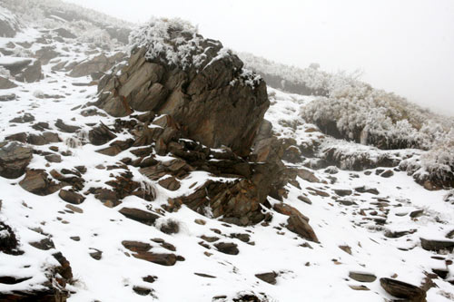 寒流发威,高山一夜间白了头。台湾玉山气象站表示,合欢山及玉山26日凌晨都飘降瑞雪,合欢山从台14甲线昆阳以上就可看到雪。图为昆阳一带的岩壁一片银白景色。 图片来源:“中央社”