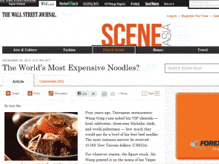 《华尔街日报》报道称,这家面店在台北东区,店里有40个座位馆,供应着世界上最昂贵的牛肉面,一碗面的最高价竟达324美元(1万新台币)。虽然该餐馆也有比较便宜、只要200元新台币的普通牛肉面,但几乎每一天,都会有客人点最昂贵的牛肉面。
