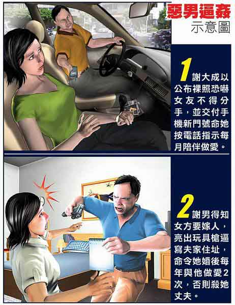 中国台湾网1月2日消息 据台湾媒体报道,台湾一男子谢大成利用一张裸照,逼一名岛内的女大学生当其性奴长达10年,规定被害人每月要和他做爱一次,直到前年4月被害人打算结婚,谢还拿玩具枪恐吓对方婚后仍须每年和他做爱两次,否则将杀害其丈夫。台湾“最高法院”日前维持2审判决,依强制性交等罪将这名恶狼判刑7年6个月,全案定谳。