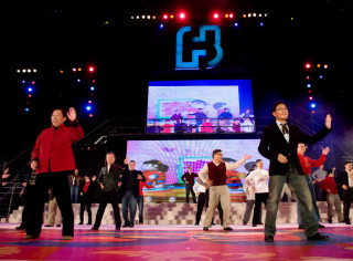 台湾富邦集团今年席开1400桌办尾牙,富邦金董事长蔡明忠与副董事长蔡明兴率领50位集团高阶主管大跳兔子舞。图片来源:台湾“今日新闻网”