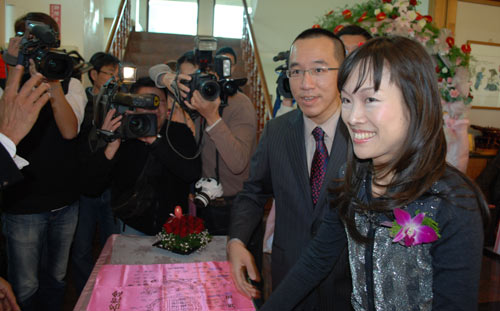 陈水扁儿子陈致中(右2)和妻子黄睿靓(右1)出席妻舅黄汉强的婚礼。图片来源:“中央社”