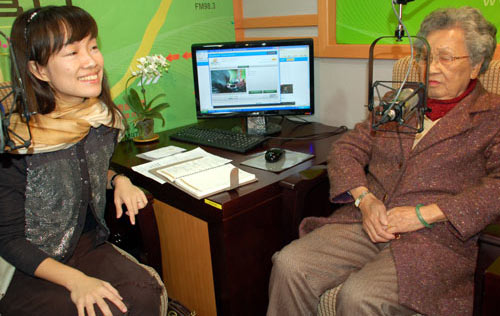 陈水扁的儿媳妇黄睿靓(左)主持广播节目,首播专访陈水扁母亲陈李慎。 图片来源:“中央社”
