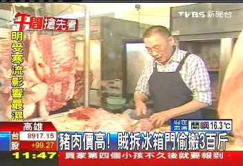 据台湾TVBS报道,年关将近,猪肉是年菜不可或缺的重点食材,价格也跟着上扬,现在传出市场的猪肉摊成了窃贼目标,高雄多个市场猪肉摊被窃,有的摊商甚至一个晚上被偷走300斤的猪肉。