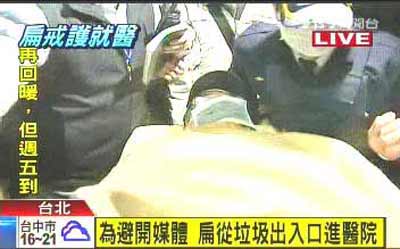 陈水扁戒护送医,抵达桃园医院时,狱方和院方为了回避媒体而选择医院垃圾出入口将扁送进医院。 图片来源:台湾TVBS