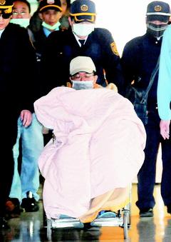 陈水扁19日上午7点25分在警方戒护下,搭乘台北监狱救护车前往桃园医院,他全身被毛毯包住,躺在担架上,只露出所戴的帽子和口罩。