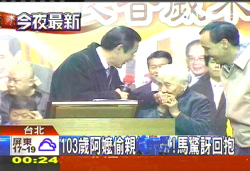 中国台湾网1月23日消息 据台湾TVBS电视台报道,马英九昨天(22日)傍晚和独居老人温馨围炉大团圆,亲手包刈包给老人吃,还被103岁的人瑞阿嬷偷吻。马英九惊讶之余,感动地拥抱阿嬷。阿嬷则说,她才是老人,在她眼中,小她40岁的马英九就像孩子。(中国台湾网 吴斌)