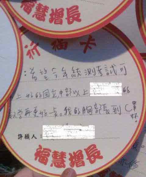 中国台湾网2月9日消息 据台湾“今日新闻网”报道,台湾一名正妹网友nanaling过年期间到关帝庙拜拜时,赫然发现在文昌帝君(民间和道教尊奉的掌管士人功名禄位之神。文昌本星名,亦称文曲星,古时认为是主持文运功名的星宿)面前出现一张让人捧腹的许愿卡。卡片除了写上希望考试能够顺利的许愿文字,后面竟然还写道愿“我的胸部长到C罩杯”,让人不禁哈哈大笑。