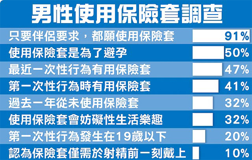 但受访男性最近一次性行为使用避孕套比率仅47%,更有32%过去一年都没用过避孕套。调查也显示,仅41%男性初夜使用避孕套。高达2成男性首次性行为发生在19岁前,另有1成误以为避孕套于射精前一刻戴上即可。