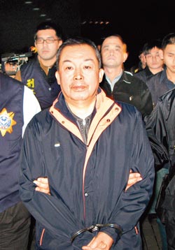 台当局“刑事局”16日在台北基隆等地破获松联帮老大吴来居(中)等人涉嫌以汽油弹纵火暴力讨债集团案。图片来源:台湾《中国时报》