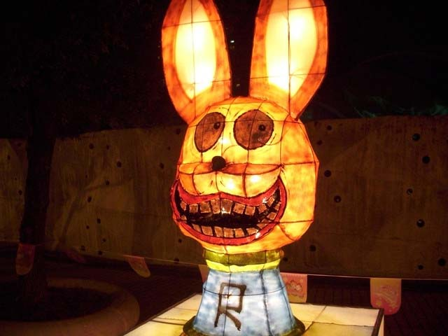 据报道,网友robbie2010受朋友之邀参观灯会,当他经过入口附近的彩绘花灯区时,却被这组可怕的兔子灯笼吓到:只见这只“殭尸兔”张着血盆大口,露出脏兮兮的牙齿,还有不怀好意的笑容;最令人感到不安之处,就是它的眼睛呈现诡异的“上吊状”,好像正在打量来往的游客们。