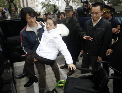 吴淑珍(中)18日由儿子陈致中(前右)陪同向高雄地检署报到,由看护抱着吴淑珍下车坐轮椅。图片来源:台湾“今日新闻网”