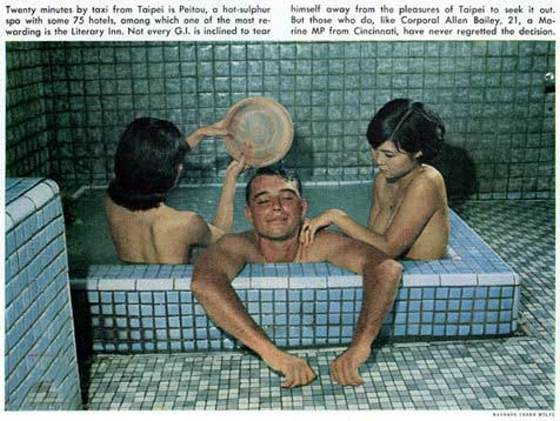 1967年12月22日,美国《时代杂志》刊登了一张台北市北投区女服务生陪浴的照片,从此台北被定性为“买春之城”。这件事让蒋介石勃然震怒。图片来源:台湾“今日新闻网”