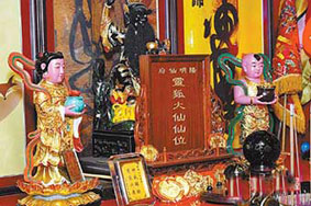 灵狐大仙仙位左有桃花仙子,右有招财童子,据称拜了可以旺人缘、桃花。图片来源:台湾媒体