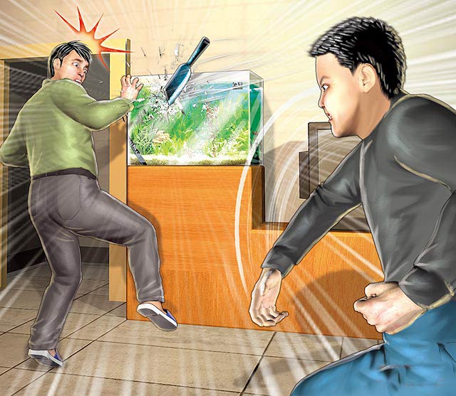 林姓少年因养父拒绝帮他养小孩,竟从背后射飞刀暗算养父,幸射破水族箱未伤及养父。图片来源:台湾媒体