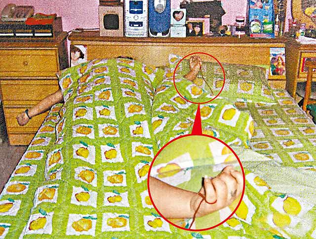 叶启贤、郭美秀自杀前,还以红线两端分别绑在女方左手(小图)、男方右手的尾指。图片来源:台湾媒体
