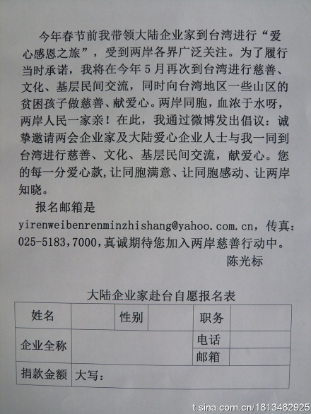 最后,陈光标提供了供企业家报名的邮箱和传真,并另附一张报名表格式。他表示真诚期待企业家加入两岸慈善行动中。(中国台湾网 冯存健)