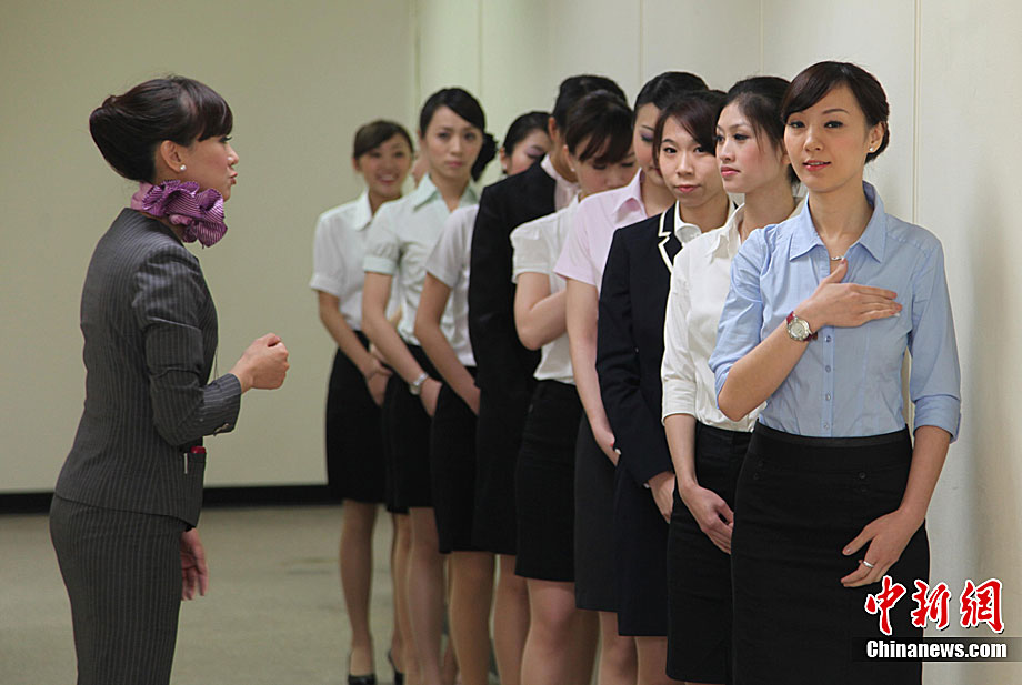 3月11日上午,台湾岛内航线及短程国际航线运营商复兴航空公司在松山机场第2航厦招考空服人员,数百名来自台湾各高校的大学生现场应聘“空姐、空哥”。图为应聘者在等候进入面试考场。(符永康 董会峰)