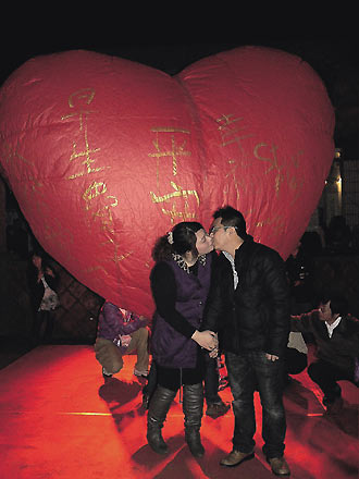 新北市昨晚在平溪区菁桐小学举办白色情人节放天灯活动,来自板桥的戴蓓蕾(左)向相恋8年的男友胡育铭(右)求婚成功后,两人一起施放心型天灯。