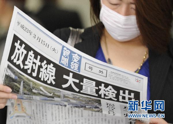 3月15日,在日本大阪,一名女士观看报纸上关于福岛第一核电站的报道。东京电力公司当日说,福岛第一核电站3号机组反应堆上方有白色蒸汽冒出,4号机组出现爆炸并发生火情。日本首相菅直人指示,居民避难半径从第一核电站周边20公里扩至30公里。新华社/共同社