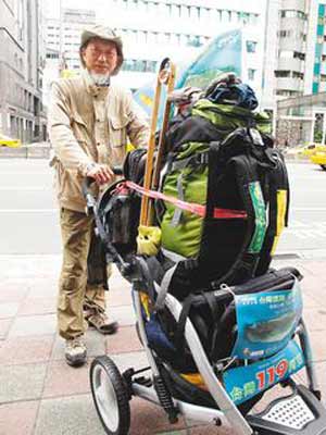 资料图:“台湾阿甘”林明德推着20公斤的行囊,一步一脚印巡回台湾。