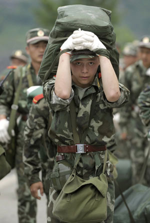 2008年5月14日,解放军战士身背救援物资向震中汶川行进。法新社