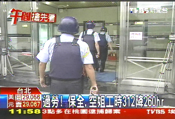 中国台湾网4月13日消息 据台湾TVBS新闻台报道,由于台湾过劳死事件频传,台当局“劳委会”调降工时。台北市率先实施,将保安、航空乘务员还有房产中介等38种行业的工时上限调整降低,从原本每月312小时降到260小时。但是新制度只有新员工适用,而且像保安这些行业的职员听闻调降工时恐拿不到加班费,并不乐观。