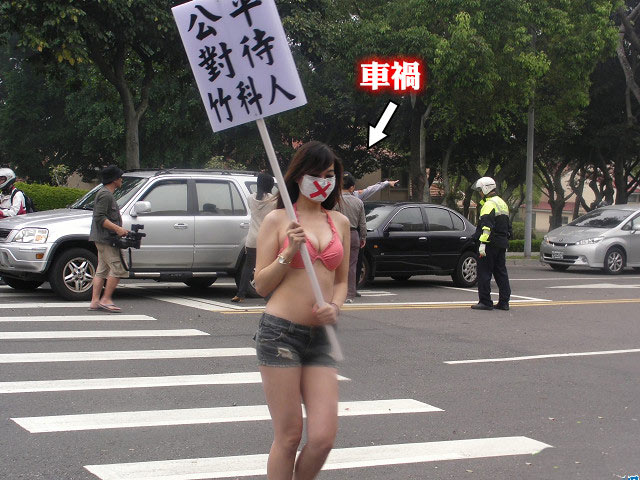 中国台湾网4月14日消息 据台湾媒体报道,台湾新竹科学园区今(14)日上午上班高峰时间,8名身材惹火的比基尼辣妹举着抗议牌子逛大街。疑因看辣妹分神,现场造成一起追撞车祸,目前事故已排除。
