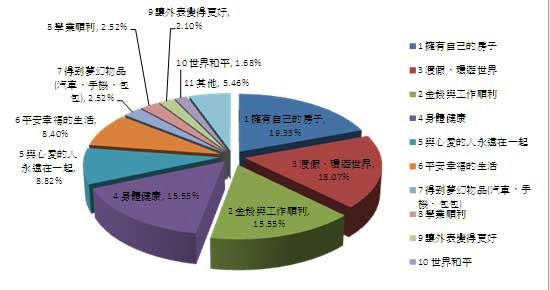 中国台湾网4月15日消息 据台湾“今日新闻网”报道,最近台湾网站上有一个“网友心愿”的统计调查,该数据显示,台湾民众最希望在2011年实现的心愿为“拥有自己的房子”(19.3%),其次为“度假、环游世界”(18.1%)、“金钱与工作顺利”(15.6%)、“身体健康”(15.6%)以及“与心爱的人永远在一起”(8.8%)。