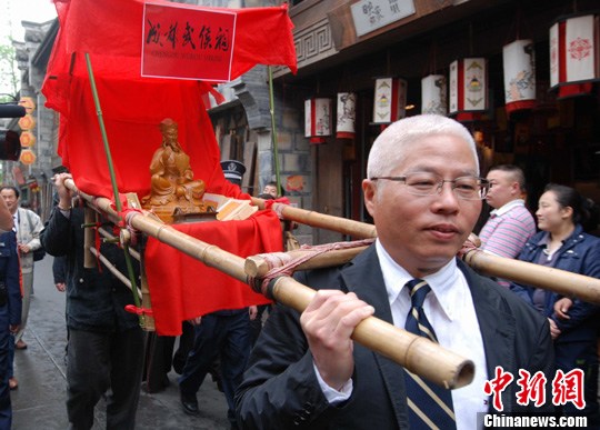 4月17日上午,在“三国圣地”成都武侯祠博物馆三义庙,台湾民间文化团体“十分老街观光发展协会”举行了隆重的祭典仪式。图为迎驾队伍走过成都锦里古街。中新社发 罗景玠 摄
