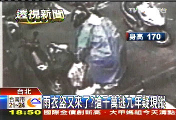 中国台湾网4月20日消息 据台湾TVBS电视台报道,近日,台北市发生提款机窃案,嫌犯的体型特征,以及作案时间,让警方立刻联想到一直未落网的雨衣大盗。据台媒了解,这名雨衣大盗从2002年开始,专门挑选梅雨季节在台北犯案,曾经抢劫好几台运钞车。