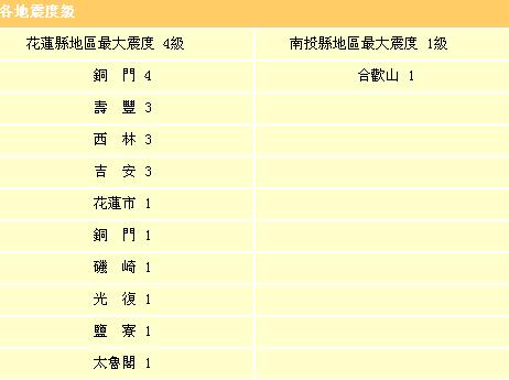 各地最大震度:花莲县铜门4级,花莲寿丰、西林、吉安为3级,太鲁阁、合欢山为1级。(中国台湾网 冯存健)