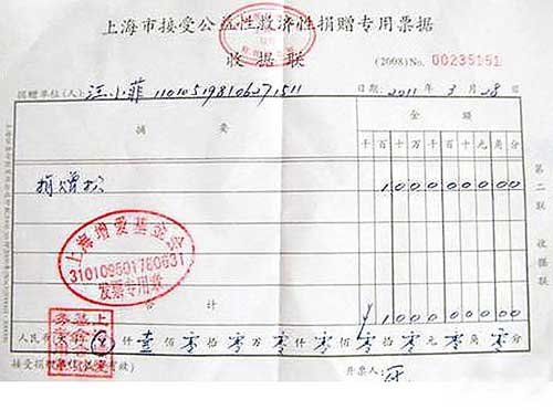 昨天,汪小菲将捐助云南及日本的2张面额共300万元人民币(1300万新台币)的捐款发票在微博上秀出,证实“确有此事”。但金额和外界所预估的约4千万台币有落差。