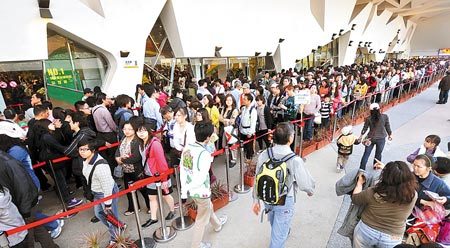 由于是花博展期的最后一个周末,拜天公作美之赐,许多入园民众几乎是全家动员、扶老携幼,举目所见,不管是在热门展馆或纪念品销售处,都是大排长龙,挤得水泄不通。