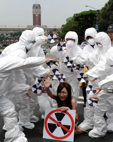 台湾歌手李宓(中)与环保团体25日到马英九官邸前演出“宁裸不核”行动剧,呼吁马英九重视能源政策与核能灾害。 图片来源:“中央社”