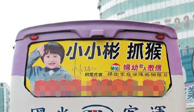 据台湾《联合报》报道,台湾知名童星小小彬替征信业者代言,写着“小小彬抓猴”(“抓猴”意为抓外遇)的广告牌,放在客运车上在台湾“趴趴走”,台中市议员抨击“儿童抓猴”是负面教育,市长胡志强认为很不妥,且违反“儿少法”,下令今天起“不撤广告就开罚”。