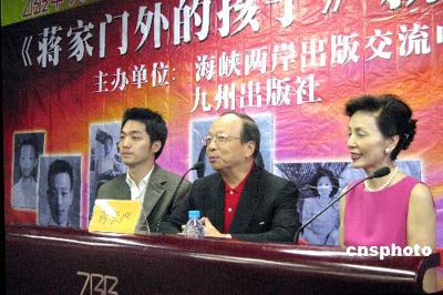 资料图:蒋介石之孙、蒋经国之子蒋孝严(中)在北京签售其新书《蒋家门外的孩子》。图为蒋孝严在签售活动中介绍自己认祖归宗的坎坷历程,和著书心得,其夫人黄美仑(右)和儿子蒋万安(左)陪同在侧。 中新社发 黄少华 摄