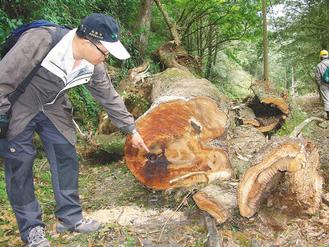 中兴大学森林系助理教授曾彦学说明,造成小火车翻覆的森氏栎腐朽情形,整棵断木测量重达7.5吨。