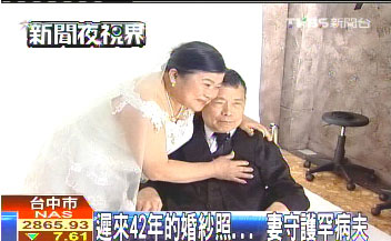 据台湾TVBS电视台报道,台中一位黄太太在结婚42年后,总算如愿披上白纱,她16岁那年,不顾家人反对嫁给先生,没公开宴客,也没拍婚纱,8年前,先生罹患小脑萎缩症,病情逐渐恶化,于是,3位儿女决定在母亲节前夕,安排爸爸套上西装、妈妈披上白纱,弥补当年没能拍婚纱照的遗憾。两人坚贞爱情令人动容。