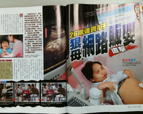 据报道,其中一名26岁的小婷,已卖了3胎,目前正准备贩卖腹中怀孕7个月的第4胎,指称生完这胎就想结扎,想对自己好一点,因此开价30万元新台币。为了证明胎儿健康,产检时主动邀请欲收养夫妻到诊所观看。
