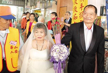 杨林平还多次大喊“太太万岁、我爱你”。阿公非常开心,不时笑开怀,阿嬷穿着细肩婚纱画着淡妆,依偎在阿公的身旁,不时显露出娇羞表情,两人以目传情,无声胜有声的眼眸,羡煞在旁观礼的民众。