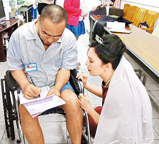 婚礼开始前,孟宪祥(左)与陈微妮先填写结婚证书。图片来源:台湾媒体