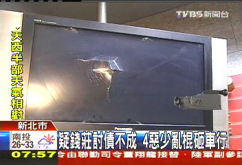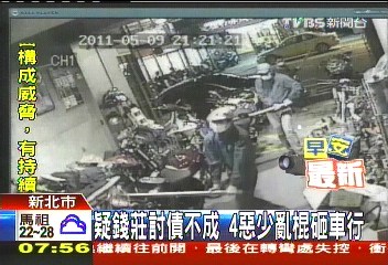 据台湾TVBS电视台报道,要钱不成竟然就砸店,昨天晚间9点半左右,台湾新北市土城区一家重型机车行,遭到4名手持棍棒的少年,疯狂乱砸,不仅店面遭殃,就连机车都被砸坏7辆,损失惨重,店主表示,3月中旬曾经遭到钱庄份子暴力胁迫,强逼签下本票,怀疑可能是当时协调不成,才会被挟怨报复。