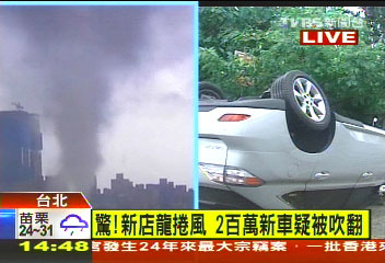 今日下午13时许,一股“漏斗云”状得龙卷风突然袭击新北市新店市区,龙卷风直冲天际,瞬间达到20层楼高,并伴随着沙沙巨响,不少杂物被卷上天空,20多部车辆被当场掀翻,情景相当怵目惊心。附近民众表示,当时他们站在旁边感觉人都快要站不住,龙卷风卷过车子和房子的时候,感觉好像要被掀翻。一名王姓居民表示,住在新店30年,从没看过这种奇怪的龙卷风,当时觉得连房子都快要被连根拔起,实在是很夸张。