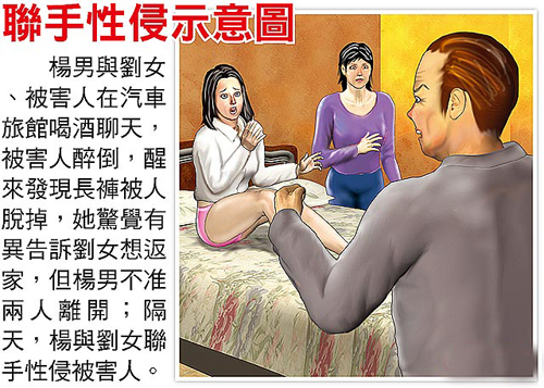 此时,同样也有醉意的杨姓男子竟指示刘姓女子脱掉被害人衣裤,然后又要求刘姓女子性侵被害人,杨姓男子在旁边观赏,后来杨姓男子干脆脱光自己衣服也加入性侵,直到被害人惊醒推开两人为止,被害人愤而报警。