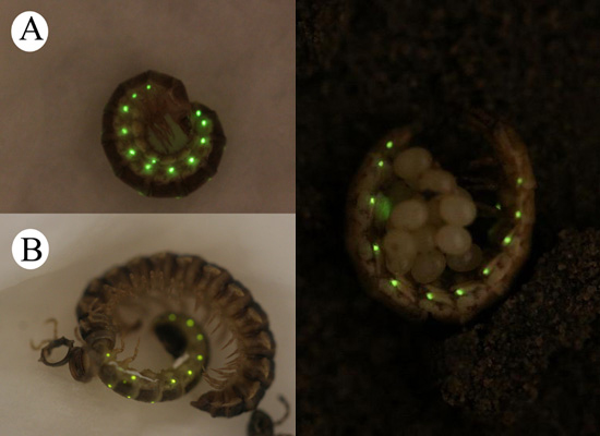 左图A为雌光萤终发光成点状,B为雌光萤正在捕食千足虫。右图为雌虫产完卵后护卵发出点状的光。图片来源:台湾“今日新闻网”