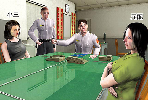 元配警局见小三示意图,中年男子偷情马上风猝死,老婆接获警方通知才知有“小三”。警员担心双方恐引发暴力冲突,在场戒护。图片来源:台湾媒体