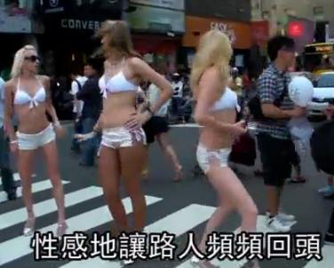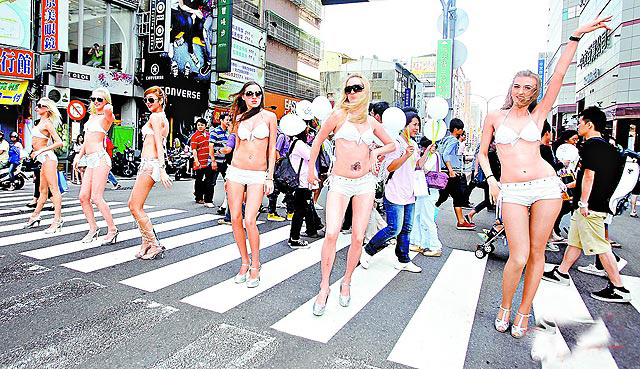 中国台湾网5月30日消息 据台湾媒体报道,一家厂商为宣传新上市美白霜,29日找6位穿着比基尼金发俄罗斯女郎,在人潮众多的三民、育才北路口利用红灯时,走上斑马线扭腰摆臀,一群初中小男生见到衣着单薄的女郎,个个害羞笑开怀;一名牵着女儿的妈妈拿出手机拼命拍照直夸,“这个画面好美。”