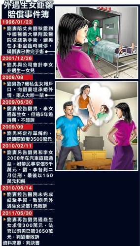 刘妻怒告两人通奸,但因过了追诉期,获检方不起诉,随后改针对通奸生女部分提告索赔300万元(新台币,下同)。刘男向台中地方法院法官表示,前年9月起倾毕生积蓄,陆续给妻子3500万元,后来因汽车旅馆通奸也赔了150万元。法官认为,刘男已陆续给妻子共3650万元,相当于刘男30年的工作收入,应已足够填补妻子的精神损害,驳回妻子求偿请求。此外,刘妻曾控告医院和丈夫联手欺骗,导致丈夫外遇生女,并向台湾医药大学附设医院象征性请求损害赔偿一元,遭判败诉。(中国台湾网 吴斌)